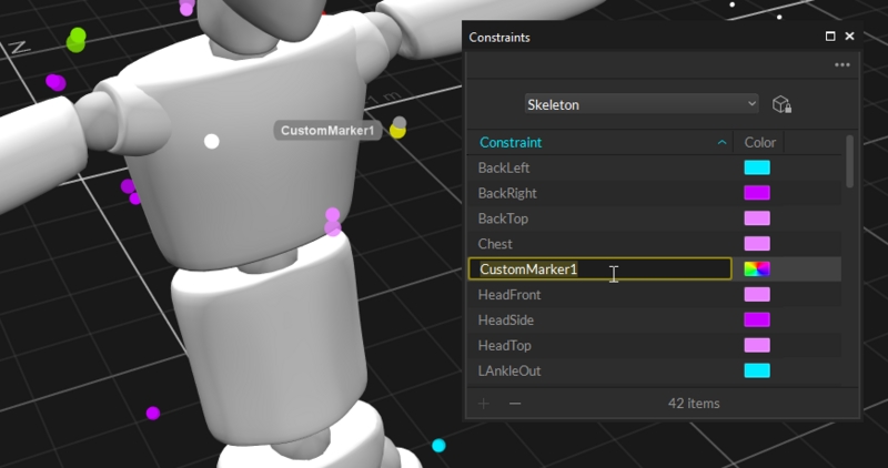 Each Skeleton asset has its marker templates stored in a Constraints XML file. A Skeleton Marker Set can be modified by exporting, customizing, and importing the Constraints XML files. Specifically, customizing the XML files will allow you to modify Skeleton marker labels, marker colors, and marker sticks within a Skeleton asset. For detailed instructions on modifying Skeleton XML files, read the Constraints XML Files page.