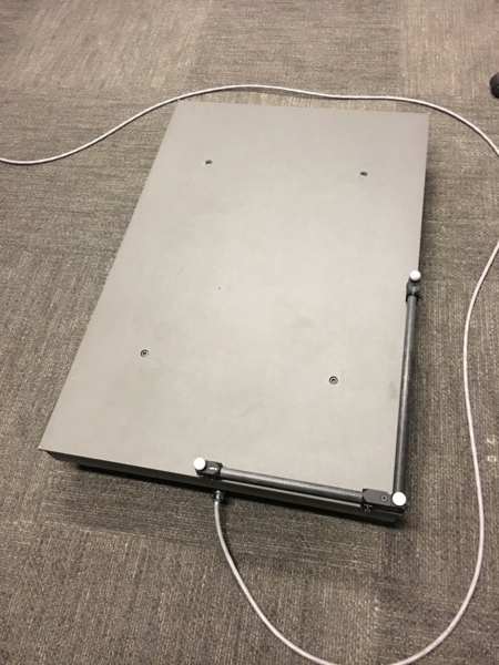 Place the calibration wand on the force plate so that vertex of the wand is located at the right-hand corner of the side where the cable input is located (as shown in the image below). A correct placement of the calibration square is important because it determines the orientation of the force plate and its local coordinate axis within the global system. The coordinate systems for force plates are independent of the system used Motive.
