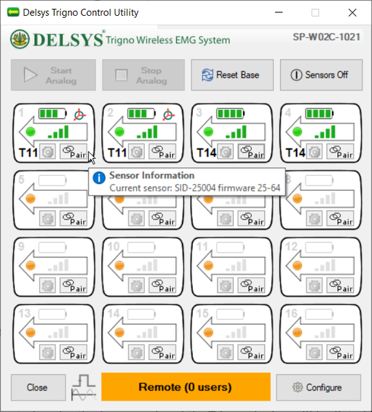 Firmware on both the Trigno base station and the sensors must be updated. If the firmware is installed, use the Software Update Tool to install the latest firmware. For more information, please refer to the manufacturer documentation.