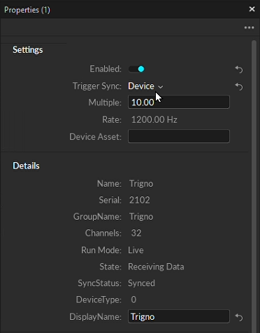 [Motive] Set the Triggered Sync setting to Device. Note that once Trigno is configured to the Triggered sync mode, EMG data will not be reporting until a recording is started to trigger the Delsys system.
