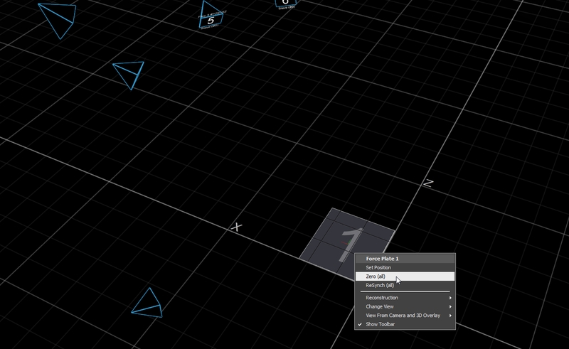 After you have calibrated each of your force plates, remove the CS-400 from the volume. Right click one of your force plates in Motive and click Zero (all). This will tare the scale and set the current force on the plate data to 0. This will account for a small constant amount of measurement offset from the force plate. Remember that it zeros all of the force plates at once. So make sure there are no objects on any of the force plates.