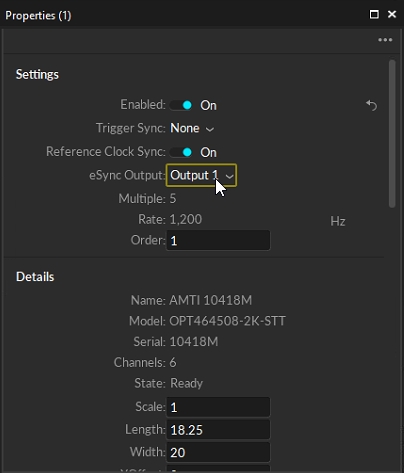 Once this is set, the force plate system will start sampling at the frequency of the clock signal configured on the eSync, and this rate will be displayed on the Devices pane as well.