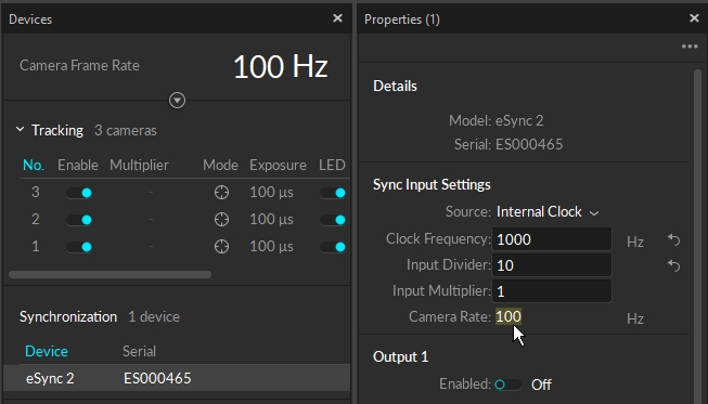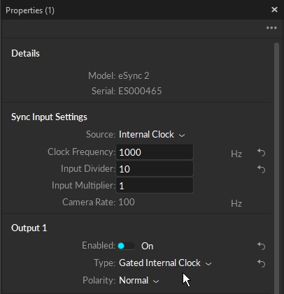 First of all, you need to select and configure the sync input source. In this setup, the Internal Clock signal of the eSync will be used to synchronize the camera system. Set the Sync Input: Source to Internal Clock.