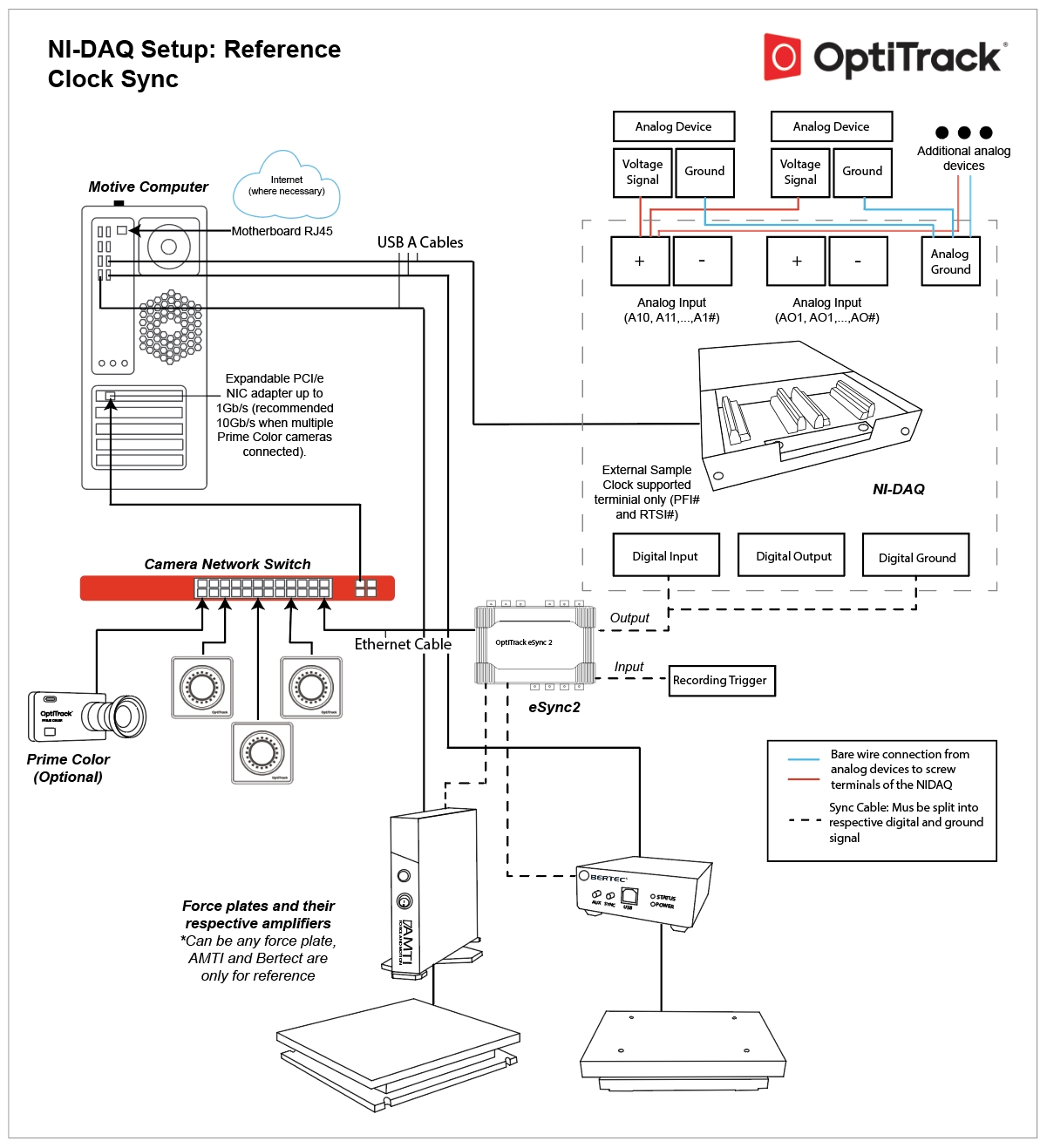 Force Plates (child): Connect the Output ports of the eSync 2 to a sync input port on the force plate amplifier. Sync Signal: Recording Pulse (AMTI) / Recording Gate (Bertec) for triggered sync. External clock sync cannot be used in this setup, because the clock signal will be used mainly for synchronizing the NI-DAQ device which usually runs at a faster sampling rate.