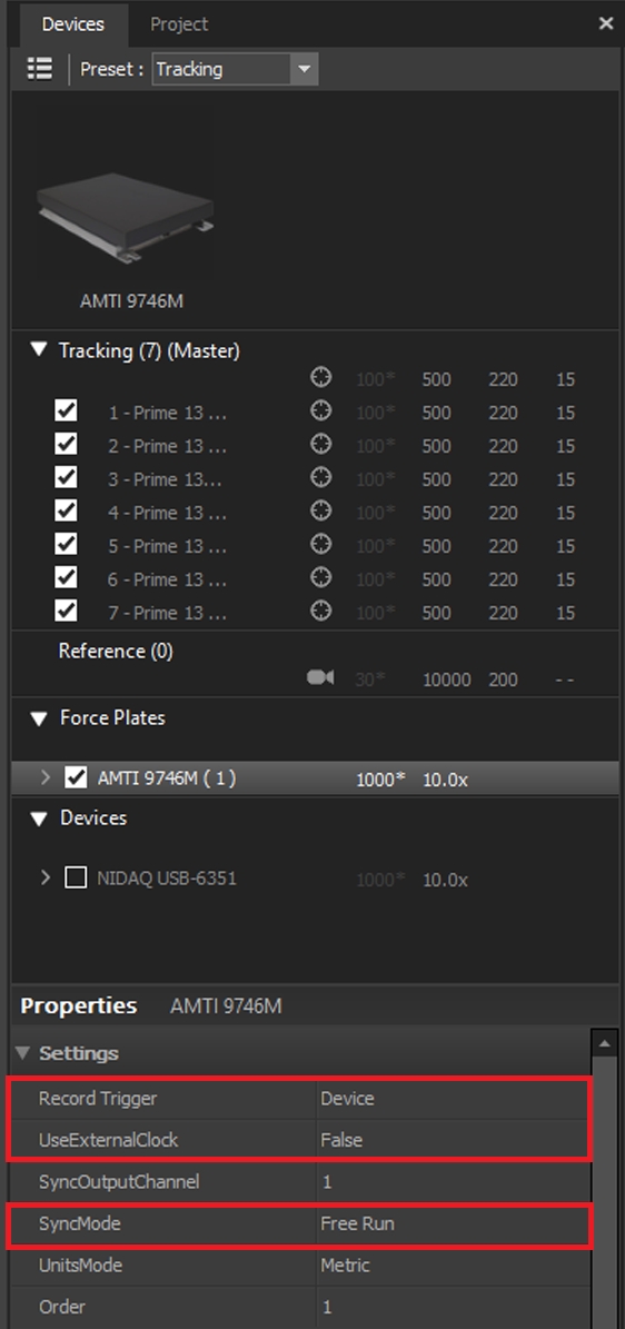 Click on the Force Plate device under the Devices pane and open the Properties pane to configure its sync properties. The following configuration sets the force plates to trigger sync to the recording signal from the eSync 2: