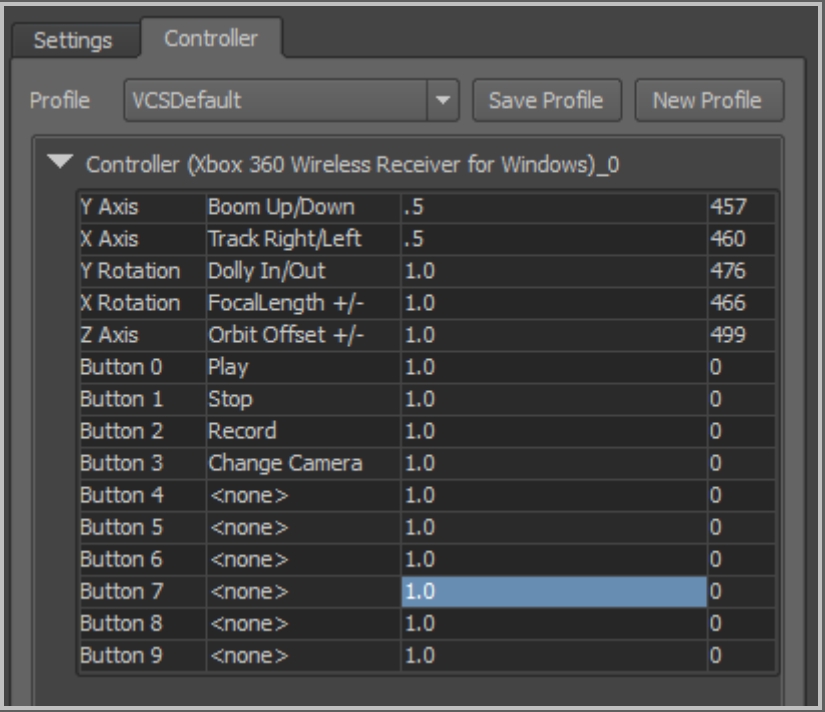 Virtual Camera controls are managed by a Control-to-Event mapping system called the Controller Profile. The controller profile is configured in the Controller Tab. The Insight VCS plugin allows you to create and swap between multiple controller profiles, allowing you to create any number of custom button/axis configurations depending upon the scene, particular move types, different physical VCS controllers or HID devices, etc.