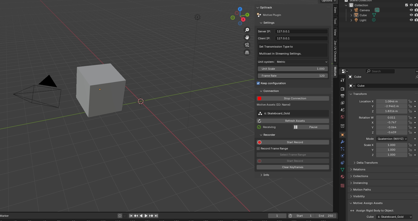 The OptiTrack Blender Plugin enables streaming of real-time Rigid Body data from Motive to Blender.