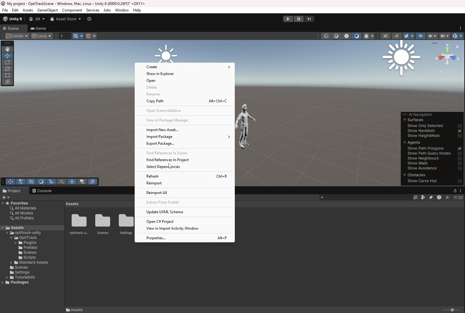 The OptiTrack Unity3D Plugin allows you to stream real-time Rigid Body, Skeleton, and HMD tracking data from Motive into Unity. Using the streamed data, objects and characters in the scene can be animated. The plugin contents are distributed in unitypackage format, and you can simply load this file into Unity projects to import its contents. Once imported, included C# scripts can be used for instantiating a client origin and receiving the tracking data. This article focuses on how to set up and use the plugin.