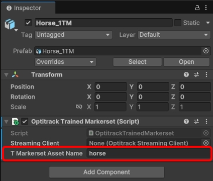 [Unity] With the asset selected in the Hierarchy tab, click the Add Component button in the Inspector tab. Search for OptiTrack, then select OptiTrack Trained Markerset from the list of available options.