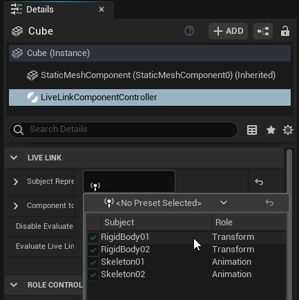 Select an actor you want to animate. In the Details tab select your "actor" (Instance). In the search bar, type in Live Link. Then click on the Live Link Controller from the populated list.