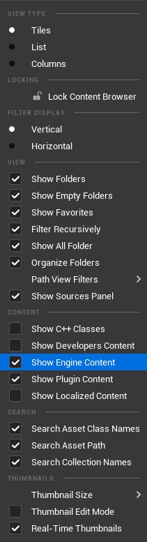 button.Check the boxes for Show Engine Content and Show Plugin Content.