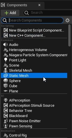 Add button in the top left of the Component pane and select Static Mesh from the list of options.