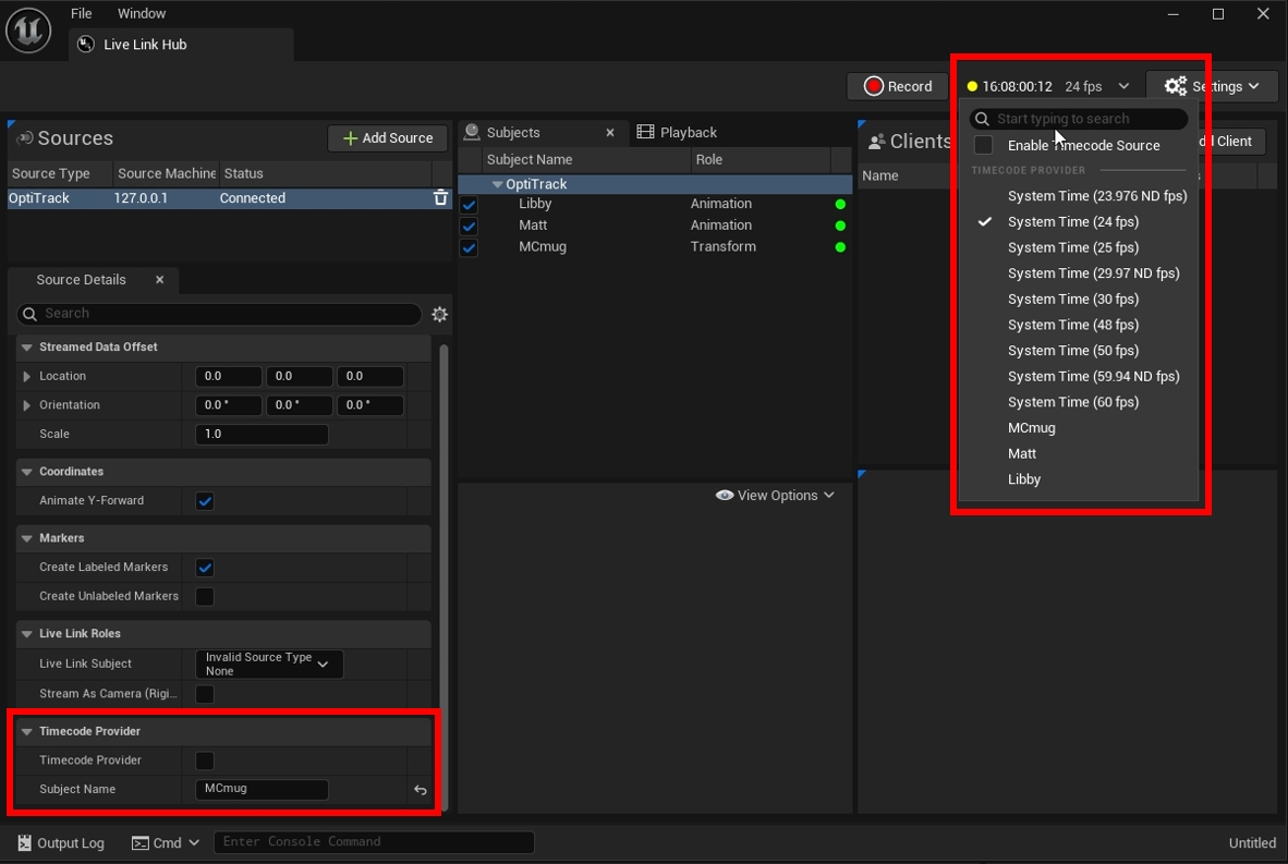 Timecode data may appear to stutter in Unreal Editor even when it is transmitting correctly. To confirm that the data is in sync, compare the timecode in Live Link Hub to the timecode in Motive.