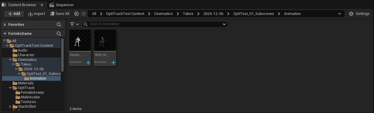 You can find the Take and the associated animations in the Cinematics folder in the Content Browser. Takes are organized with a folder for each subscene. The animations recorded in that subscene are stored in an Animation folder, one for the Device Mannequin and one for the Motive Avatar.