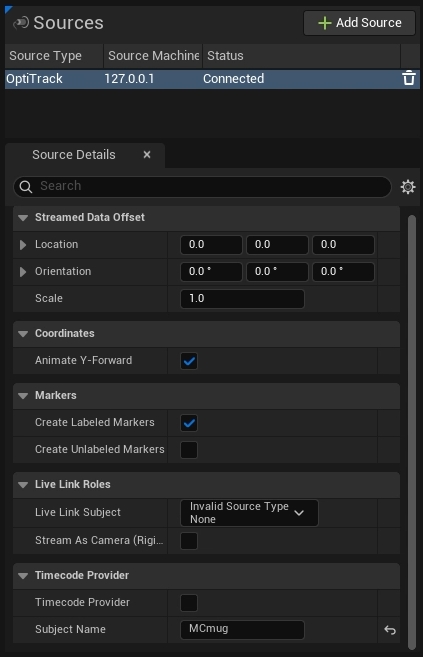 Properties are shown in the Source Details tab when the OptiTrack source is selected. The properties that are applicable to Fortnite characters are listed below.
