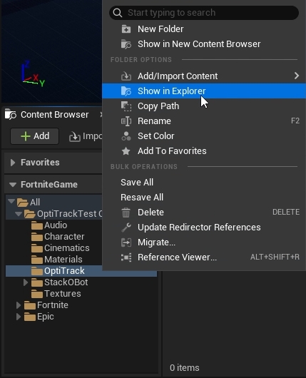 In the Content Browser, copy the following files and folders from All > Engine > Plugins > OptiTrack - Live Link Content > Animations to the project folder: