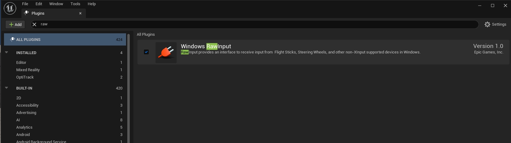 Go to Edit tab → Plugins to open the plugins panel. Enable the Windows RawInput plugin under the Input Devices group.