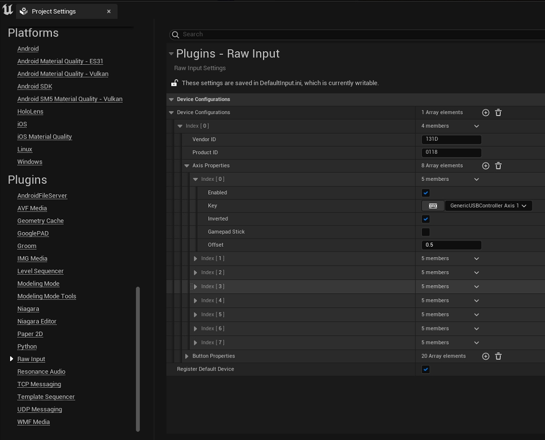 In Edit tab → Project Settings, scroll to the bottom on the left side panel until you see Raw Input under the plugins group. Here you will let UE project know which input devices to use.
