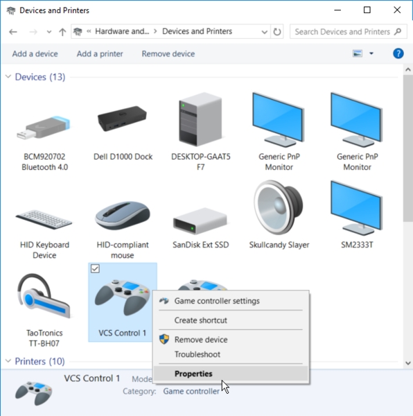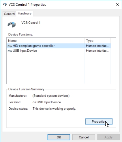 To find these IDs, you will need to look at the windows device properties. Go to Windows Control Panel -> Devices and Printers. Then right-click on the VCS controllers to access its properties. In the properties, go to the Hardware tab and click properties for “HID-compliant game controller”.