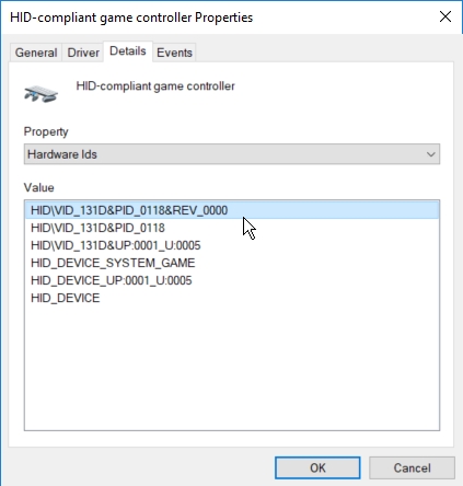 Once you access the controller properties, go to the details tab. Select Hardware ID in the drop-down menu and the hardware ID (HID) and product ID (PID) will be shown under the highlighted section.