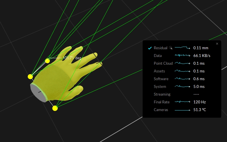 Before going into details on precision tracking with an OptiTrack system, let's start with a brief explanation of the residual value, which is the key reconstruction output for monitoring the system precision. The residual value is an average offset distance, in mm, between the converging rays when reconstructing a marker; hence indicating preciseness of the reconstruction. A smaller residual value means that the tracked rays converge more precisely and achieve more accurate 3D reconstruction. A well-tracked marker will have a sub-millimeter average residual value. In Motive, the tolerable residual distance is defined from the Reconstruction Settings under the Application Settings panel.