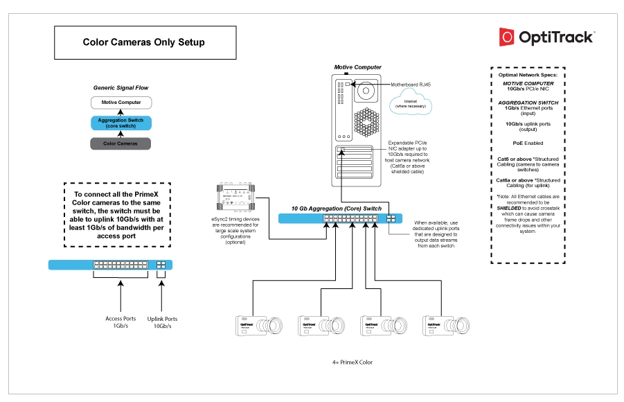 When using multiple Prime Color cameras, we recommend connecting the color cameras directly into the 10-gigabit aggregation (uplink) switch. This configuration allows the data to travel directly through the uplink switch to the host computer through the 10-gigabit network interface. This also separates the color cameras from the tracking cameras.