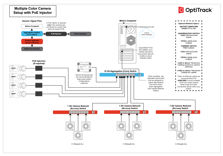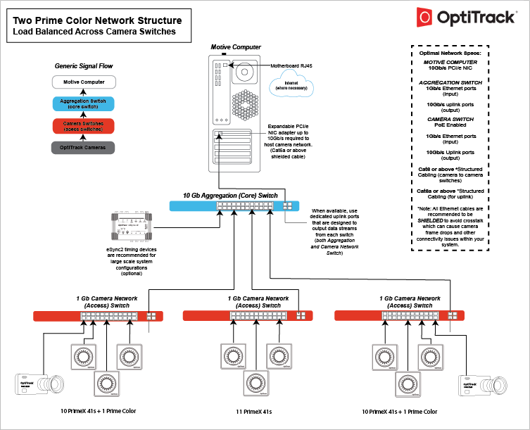 For 1-2 Prime Color Cameras we recommend using a 1Gbps network switch with 1Gbps uplink port and a 1Gpbs NIC or higher. For 3+ Prime Color Cameras it is required to use network switches with a 10Gbps uplink port in conjunction with a 10Gbps designated NIC and their appropriate drivers.