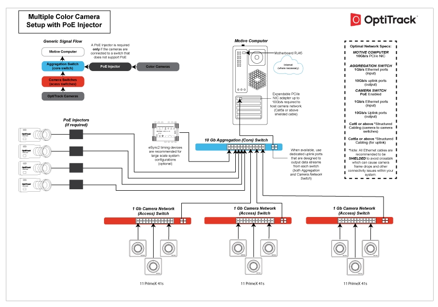 Please note that if your aggregation switch is PoE, you can plug your Prime Color Cameras directly into the aggregation switch. PoE injectors are optional and are only required if your aggregation switch is not PoE.