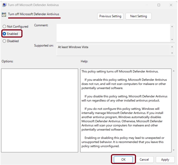 Once this policy is implemented, the Windows Defender Antivirus cannot be re-enabled in Virus & Threat Protection.