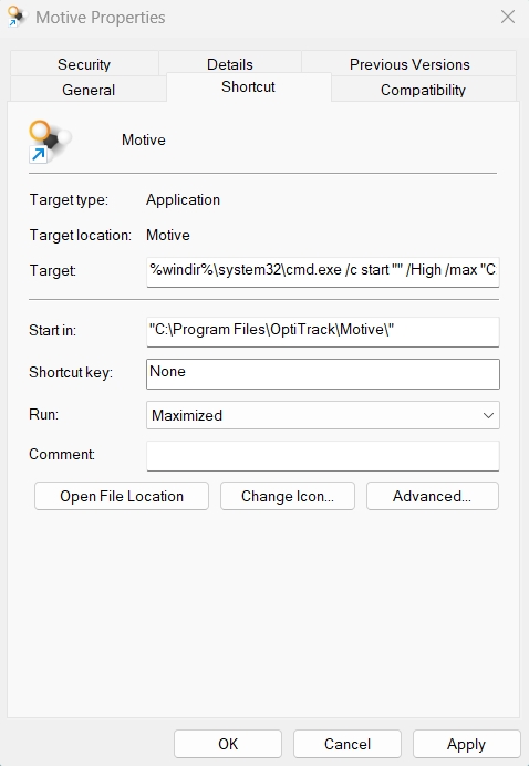 C:\Windows\System32\cmd.exe /C start "" /high "C:\Program Files\OptiTrack\Motive\Motive.exe"