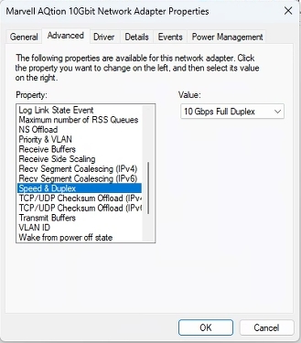 The property should be set to the highest throughput of the NIC. For example, if you have a 10Gbps NIC, select 10Gbps Full Duplex.