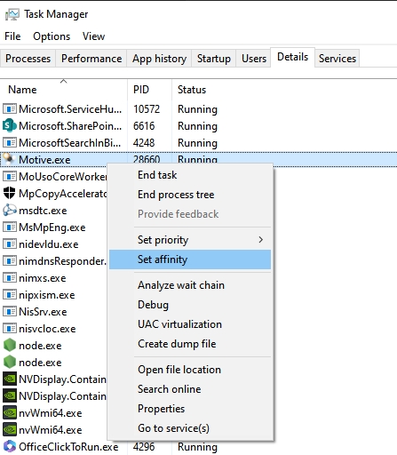 From the Task Manager, navigate to the Details tab and right click on Motive.exe.