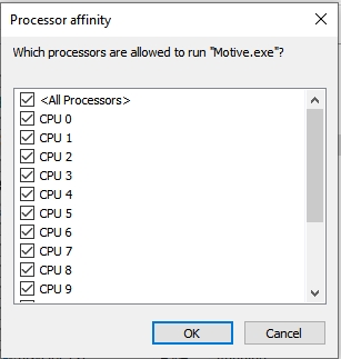 From this window, uncheck the cores you wish to disable for Motive.exe to run on.