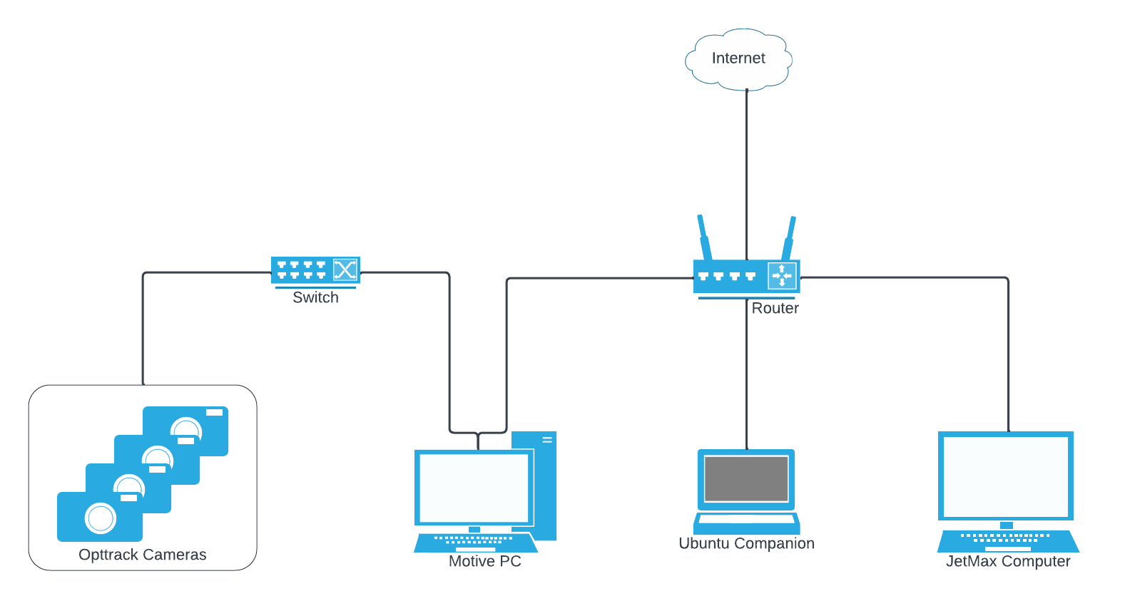 * The OptiTrack camera network, with only the cameras and the Motive PC connected. For more details about configuring the camera network, please see the [Ethernet Camera Network Setup](https://docs.optitrack.com/hardware/cabling-and-wiring) chapter.&#x20;
