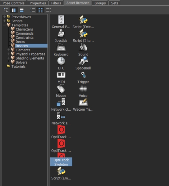 In the Navigator window, select OptiTrack Skeleton from the Devices node