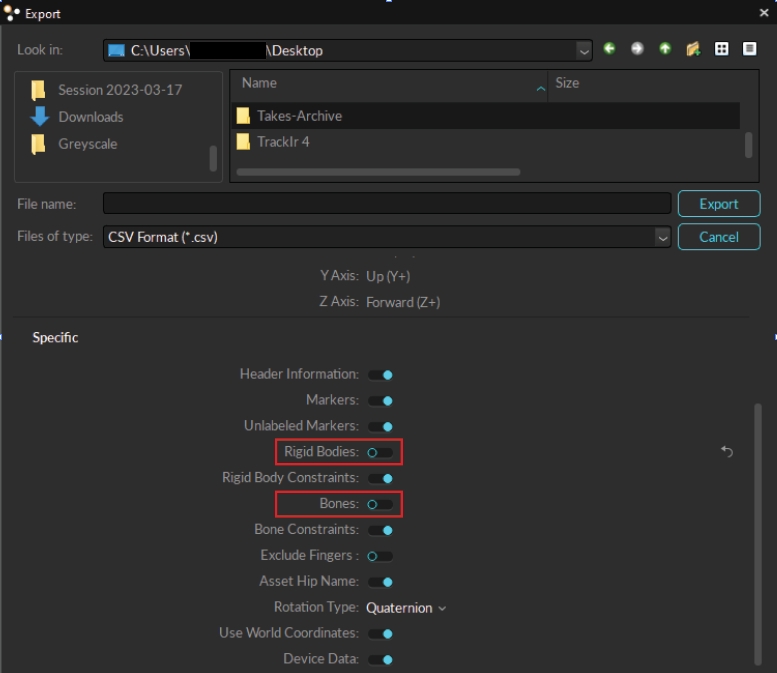 Opens the Export dialog window to select and initiate file export. Valid formats for export are CSV, C3D, FBX, BVH.