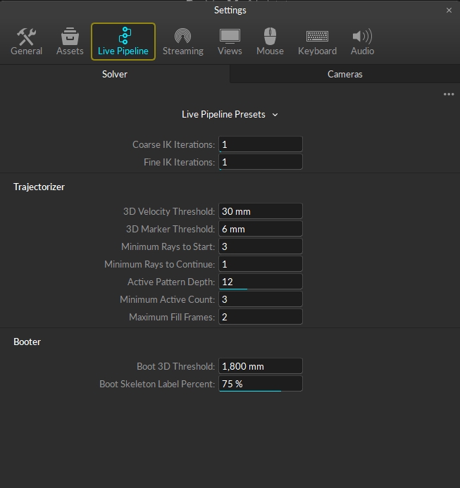 These are general tracking settings for the solver not related to creating 3D markers or booting assets. Do not change these settings in Live mode as incorrect settings can negatively affect the tracking, this is mostly useful when optimizing 3D data for recorded captures with actors in difficult positions to track.
