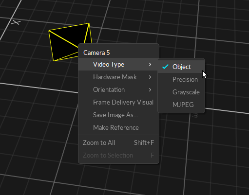 (Tracking Mode) Object mode performs on-camera detection of centroid location, size, and roundness of the markers, and then, respective 2D object metrics are sent to the host PC. In general, this mode is best recommended for obtaining the 3D data. Compared to other processing modes, the Object mode provides smallest CPU footprint and, as a result, lowest processing latency can be achieved while maintaining the high accuracy. However, be aware that the 2D reflections are truncated into object metrics in this mode. The Object mode is beneficial for Prime Series and Flex 13 cameras when lowest latency is necessary or when the CPU performance is taxed by Precision Grayscale mode (e.g. high camera counts using a less powerful CPU).