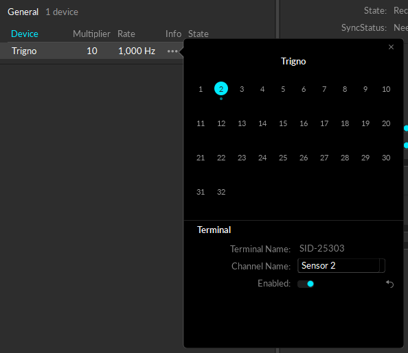Once you have enabled all of the desired data channels, enable the Trigno device from the Devices pane.