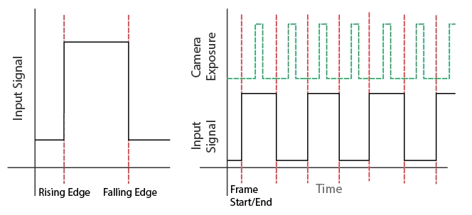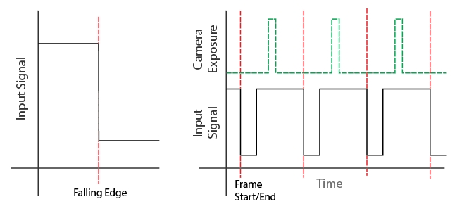 Once the input source is set, the next step is to define an appropriate trigger event. Under the Sync Input → Input Trigger option, pick a signal morphology (Either Edge, Rising Edge, or Falling Edge) for the desired trigger event. Note that the suitable event will vary depending on characteristics of the received signal and how you want the system to synchronize with it. The following diagrams show how the camera system responds to received signal triggers. When configured properly, the camera system will expose in respect to the sync signal from the parent device.