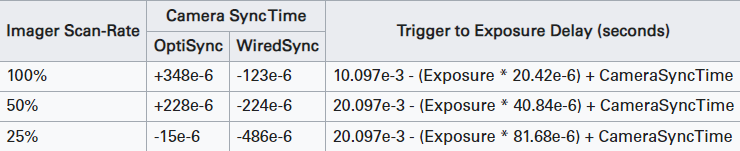 Note that the precise moment of the camera exposure does not exactly coincide with the sync input trigger event. There is a fixed latency between these two events due to specific implementation of the sensors used in the cameras. This delay from the onset of the trigger-event to the start of exposure on the cameras can be calculated as the following: