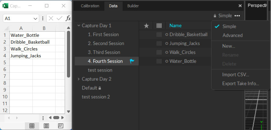 A list of take names can be imported from either a CSV file or carriage return texts that contain a take name on each line. Using this feature, you can plan, organize, and create a list of capture names ahead of actual recording. Once take names have been imported, a list of empty takes with the corresponding names will be listed for the selected session folder.