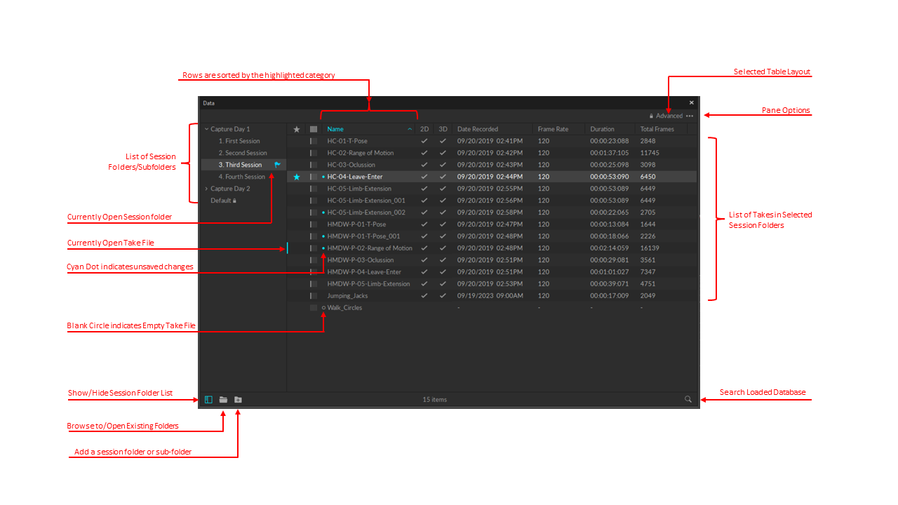 The leftmost section of the Data pane is used to list out the sessions that are loaded in Motive. Session folders group multiple associated Take files in Motive, and they can be imported simply by dragging-and-dropping or importing