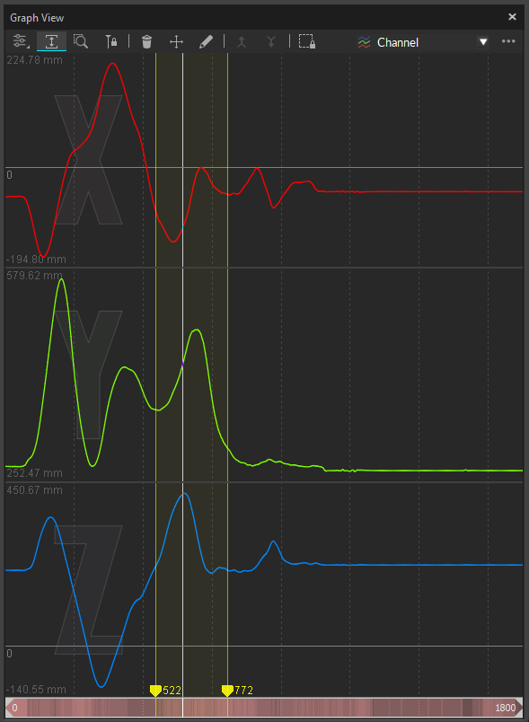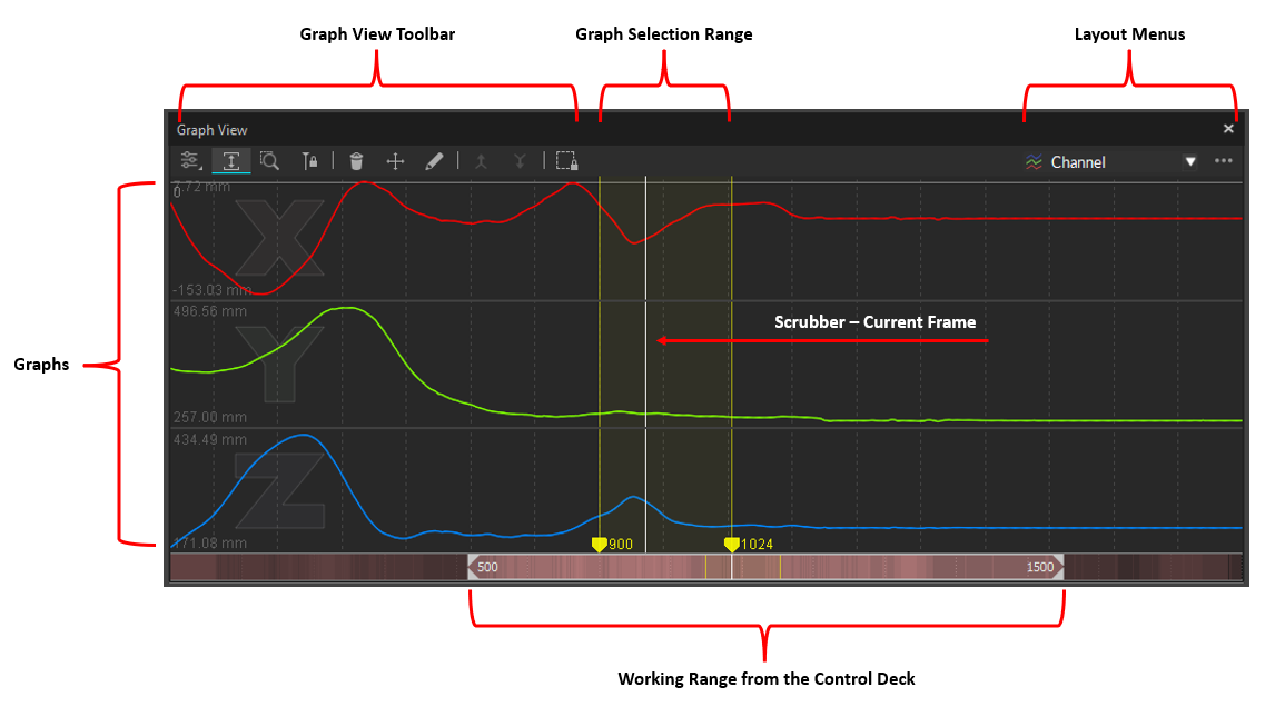The selection range is used to apply post-processing edits only onto a specific frame range of a Take. Selected frame range will be highlighted in yellow on both the Graph View pane and the Timeline in the Control Deck.