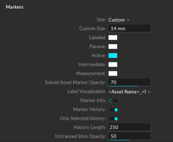 (Default: white) Set the color for labeled markers. Markers labeled using either a Rigid Body or Skeleton solve are colored according to their asset properties.