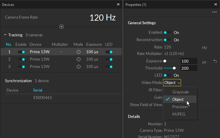 (Tracking Mode) Object mode performs on-camera detection of centroid location, size, and roundness of the markers, and then, respective 2D object metrics are sent to the host PC. In general, this mode is best recommended for obtaining the 3D data. Compared to other processing modes, the Object mode provides smallest CPU footprint and, as a result, lowest processing latency can be achieved while maintaining the high accuracy. However, be aware that the 2D reflections are truncated into object metrics in this mode. The Object mode is beneficial for Prime Series and Flex 13 cameras when lowest latency is necessary or when the CPU performance is taxed by Precision Grayscale mode (e.g. high camera counts using a less powerful CPU).