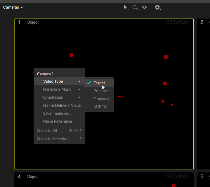 To switch between image processing modes, simply right-click on the camera from the 2D camera preview pane and select the desired video type.
