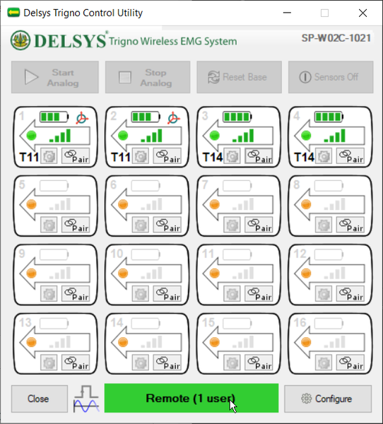 Before proceeding with integrating the EMG system into Motive, please make sure the required software for the Delsys Trigno Avanti sensor system is all set up on the host computer. This includes Trigno Control Utility software which will get along with the Trigno EMGworks or Delsys SDK Server package version 3.5.8. For the sensor to work in Motive they must first be configured and paired in the Delsys Trigno Control Utility (TCU) software.