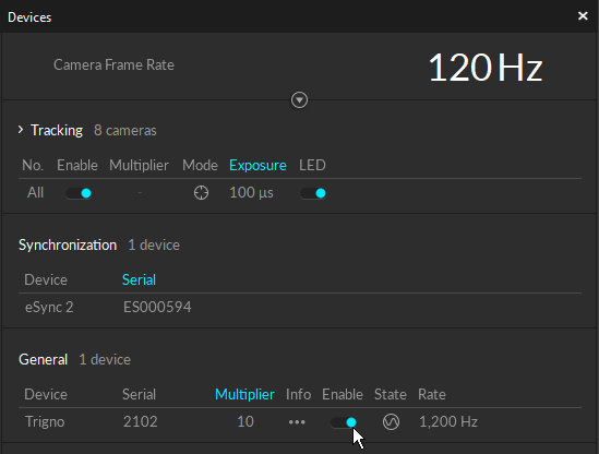 Once you have enabled all of the desired data channels, enable the Trigno device from the Devices pane.