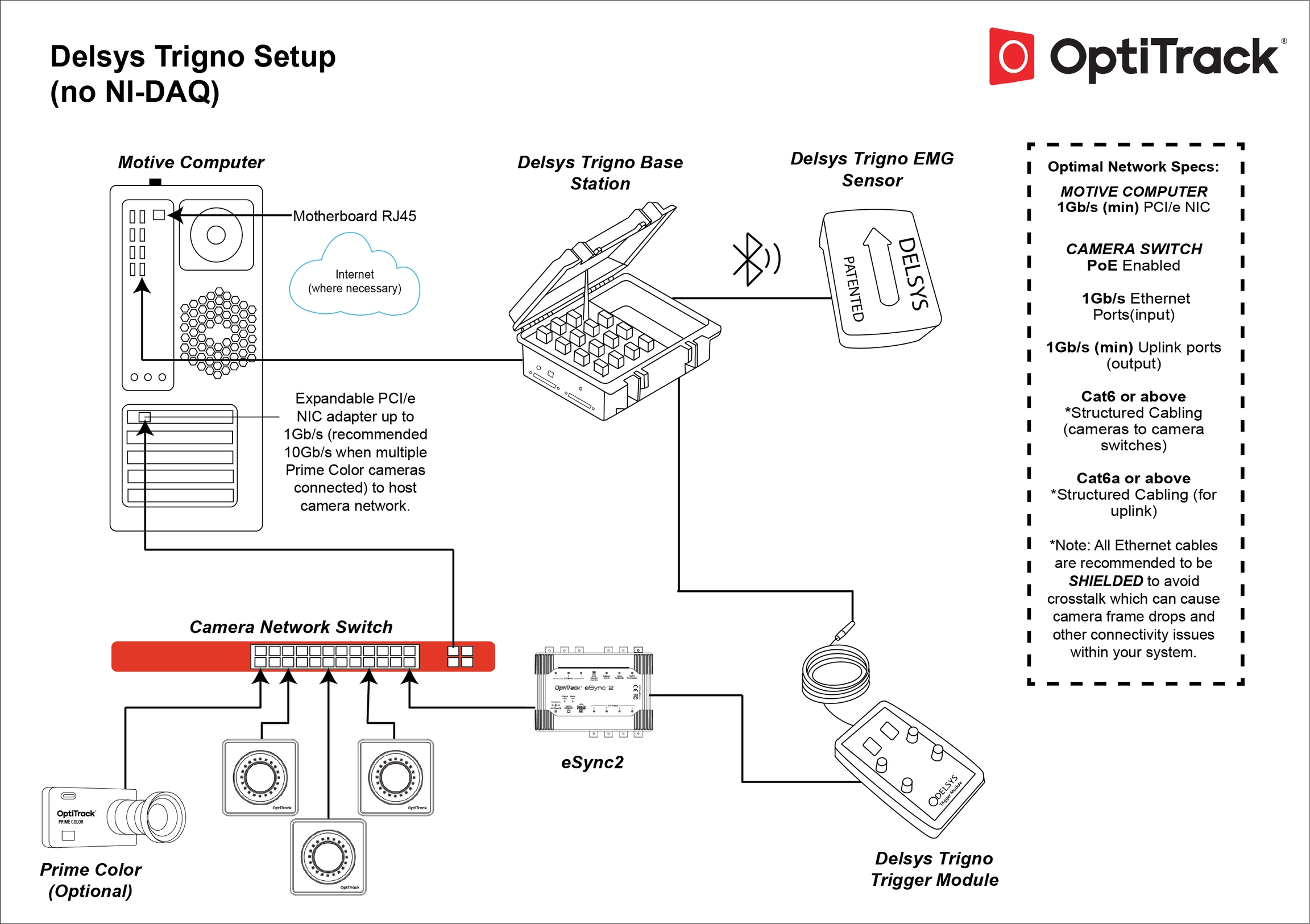 Starting from Motive version 3.0 and above, the digital integration of Delsys Trigno Avanti systems is supported. Through this integration, electromyography (EMG) measurements from the Trigno Avanti EMG sensors can be recorded in Motive along with the tracking data. This page provides instructions on how to set up the Delsys Trigno Avanti platform along with the OptiTrack motion capture system.